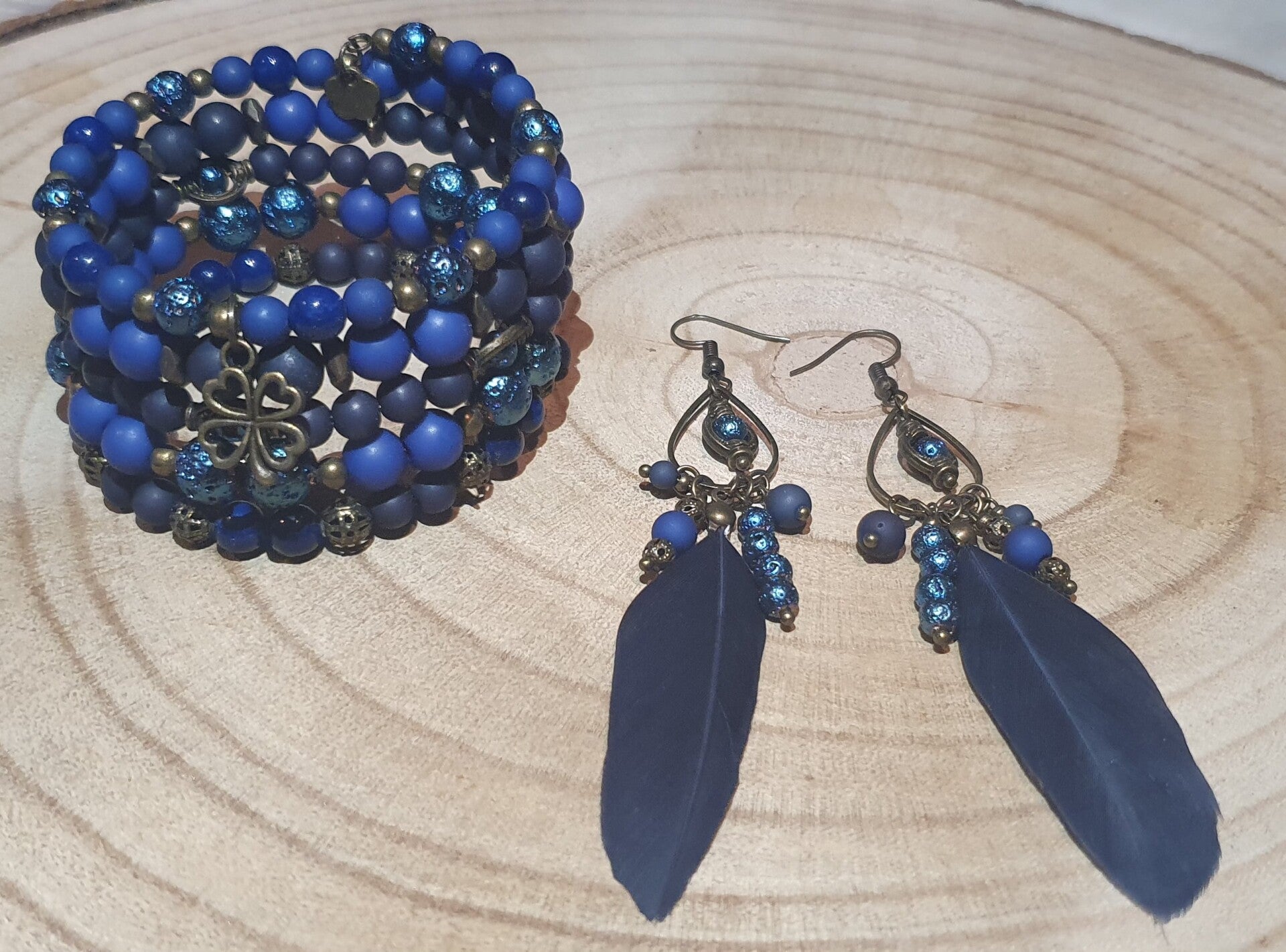 Blauw met bronze memorywire armband met leuke bijpassende veren oorbellen!